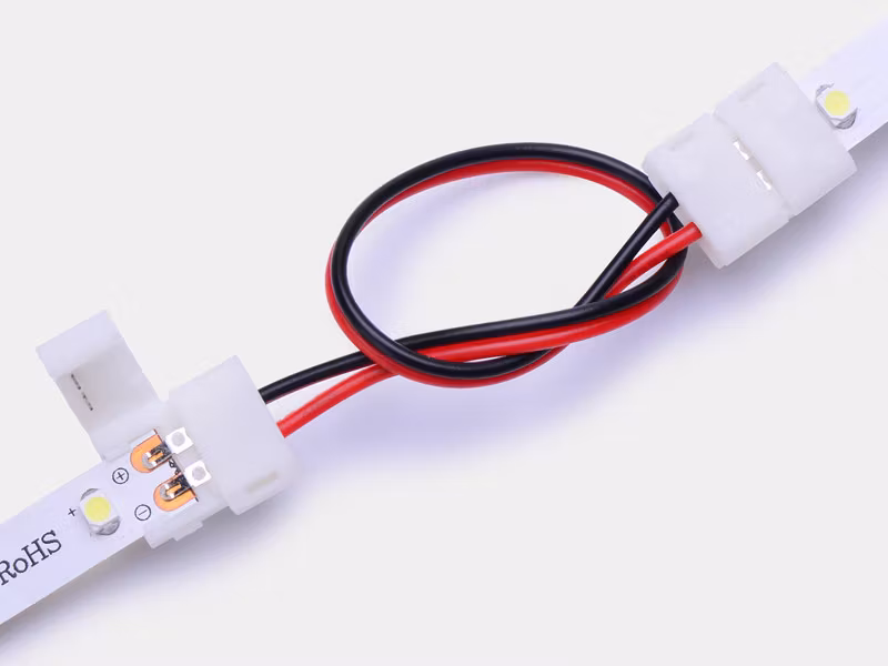 Mellankoppling på 15cm kabel med dubbla lödfria kontakter. Kontakten låses på kopparbläcken med en hasp. Genom att använda kontakten slipper man löda fast sladdar. Istället spänner man fast kontakterna på ledstripen för att koppla ihop två längder. Till exempel i ett hörn.