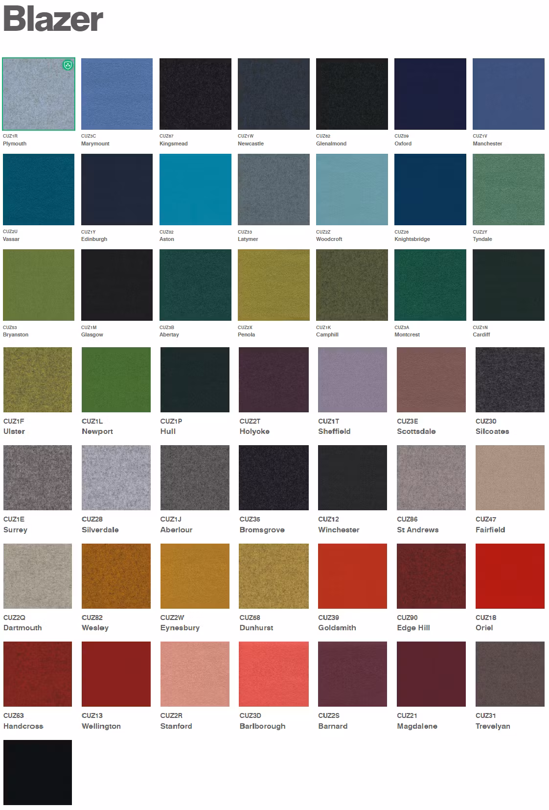 Välj din färg nedan om du valt material BLAZER i menyn. (alla färger visas med reservation för avvikelse mot verklighet)